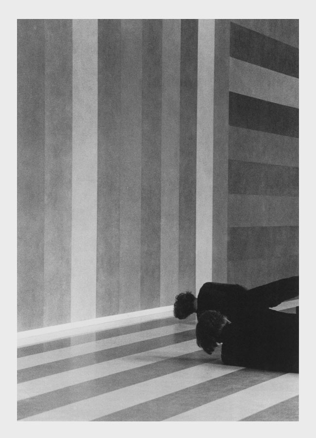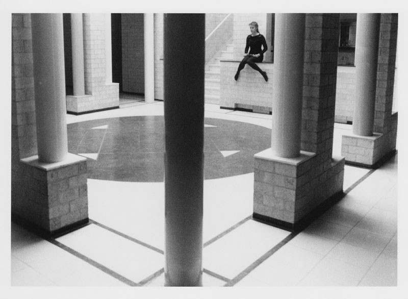 Birgit Albrechts in de foyer, verbouwd door Charles Vandenhove met wandschildering van Sol Lewitt