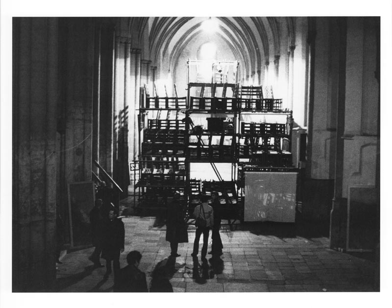 De constructie, door het participerende publiek vol gezet met kerkstoelen